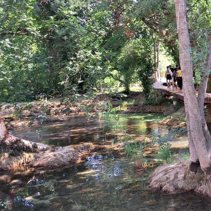 Zodra je bij de ingang van het Krka Nationaal Park afstapt, merk je meteen dat het anders voelt dan de weg waar je net vandaan komt. Het gebrom van motoren maakt plaats voor het constante geluid van stromend water. Het pad voert je langs houten bruggetjes en tussen bomen door, terwijl heldere beekjes onder je door lopen. Je ruikt natte aarde en dennen simpel, fris, en precies wat je nodig hebt na een stuk rijden.