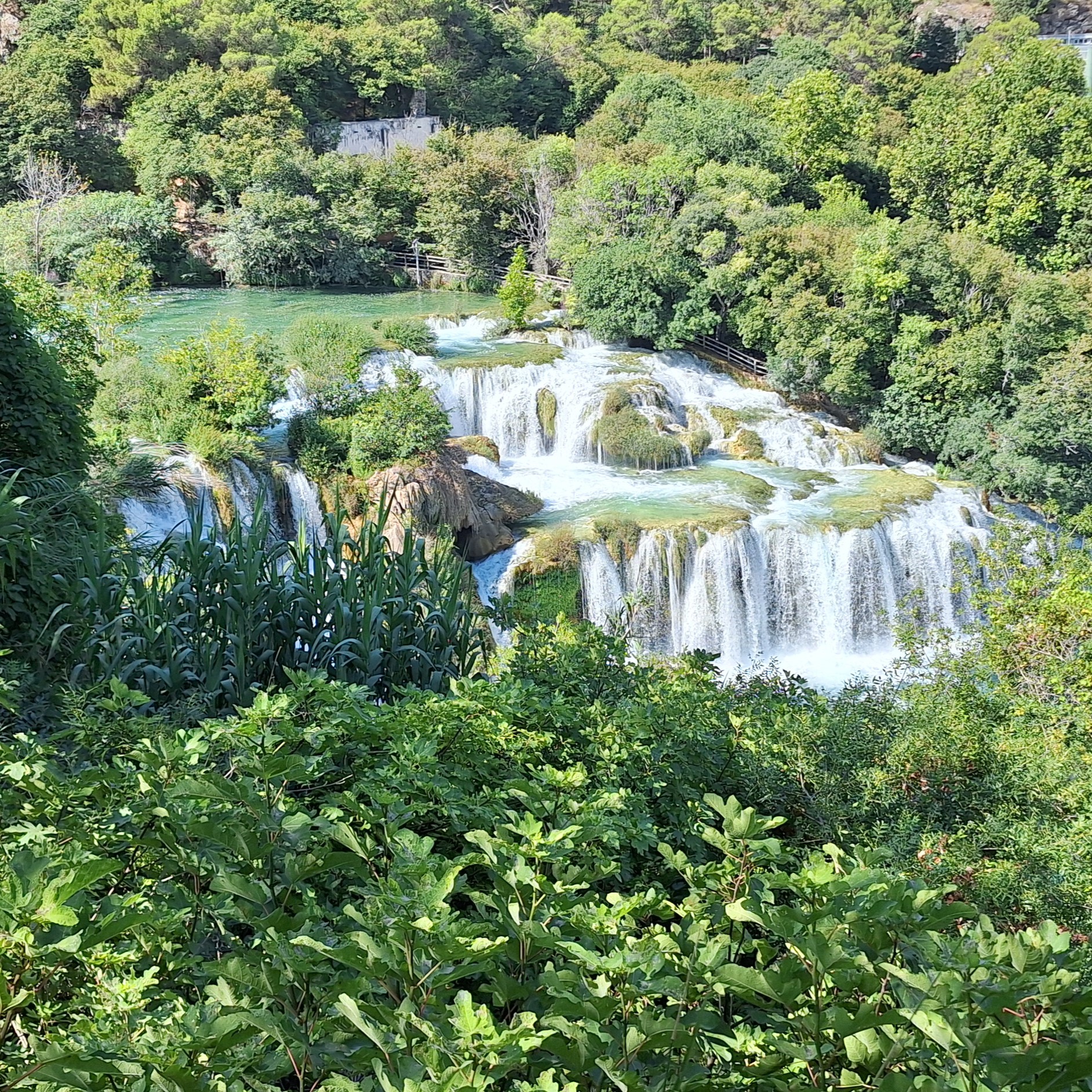 Vandaag blijven we op de camping in Šibenik. Even geen helm, geen motorlaarzen althans niet voor een paar uur. We gaan de Krka-watervallen bezoeken: een soort cultuurdag, maar dan met water, natuur en waarschijnlijk heel veel foto’s. Het wordt warm, 35 graden, dus een beetje verkoeling tussen de watervallen is meer dan welkom.
