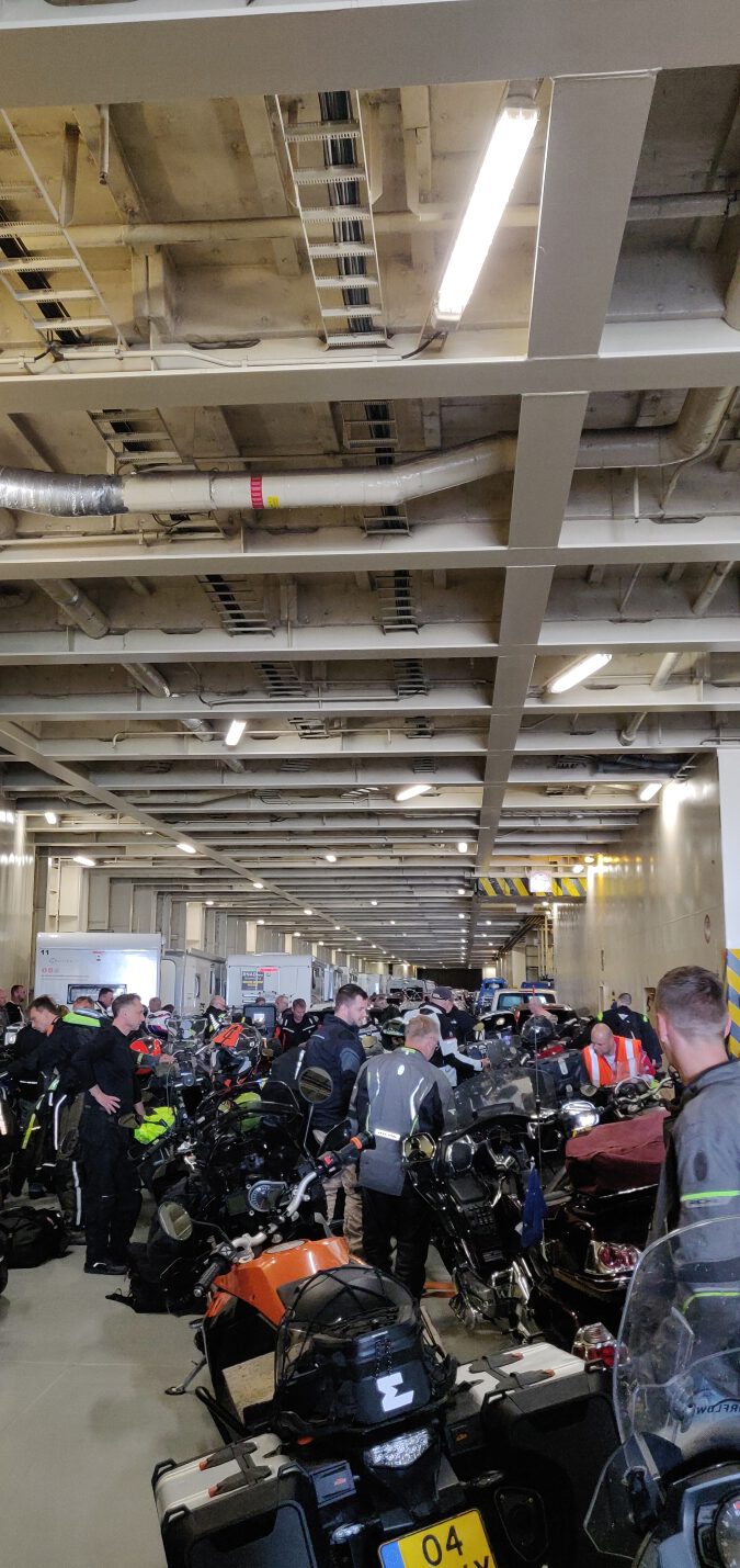 Op onze laatste dag maken we nog een kleine rondrit rondom Kristiansand. Het is een ontspannen rit, meer om afscheid te nemen van de Noorse wegen dan om nog iets nieuws te ontdekken. Zodra we bij de terminal aankomen, begint het bekende ritueel: wachten. En we zijn niet de enigen – tientallen motorrijders verzamelen zich, klaar voor de overtocht. Zoals altijd mogen de motoren als laatste aan boord.