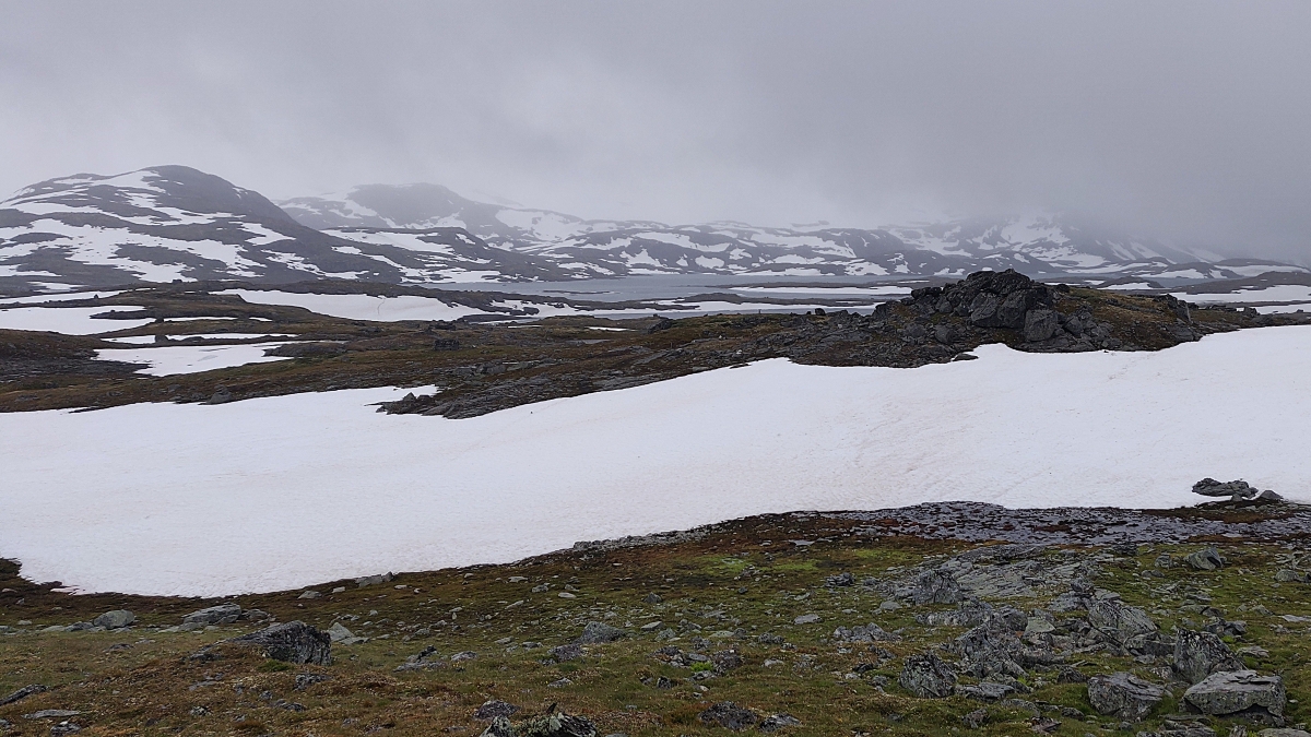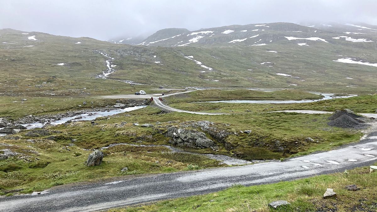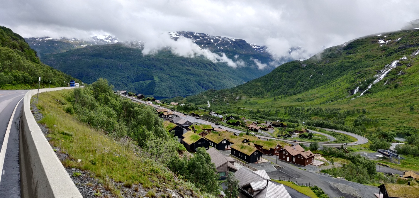 Onze bestemming voor vandaag was Lærdal, waar we zouden gaan kamperen. Omdat het weerbericht aangaf dat het morgen flink zou opklaren, besloten we vandaag niet opnieuw de bergen in te trekken om te vermijden dat we vast zouden lopen in de laaghangende bewolking.