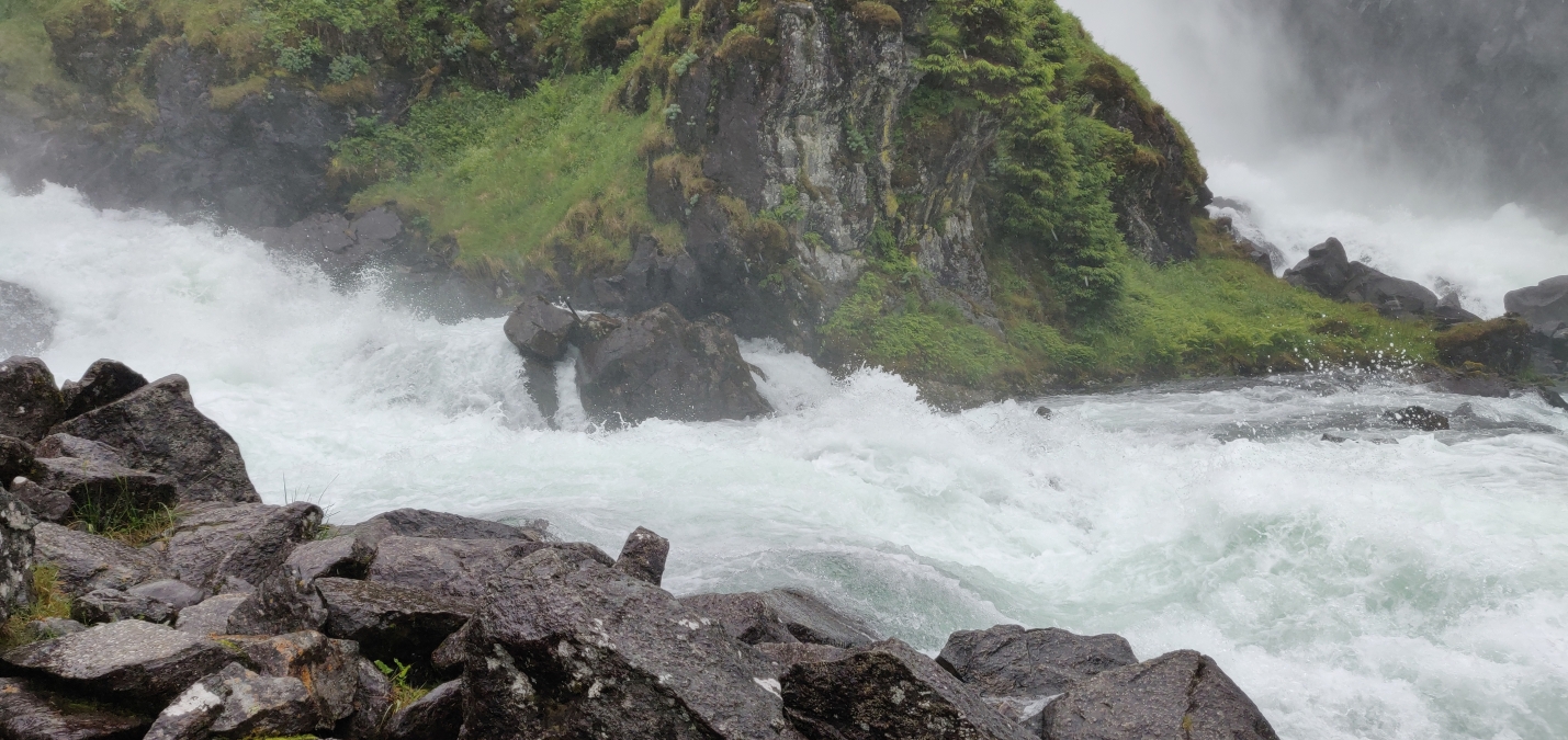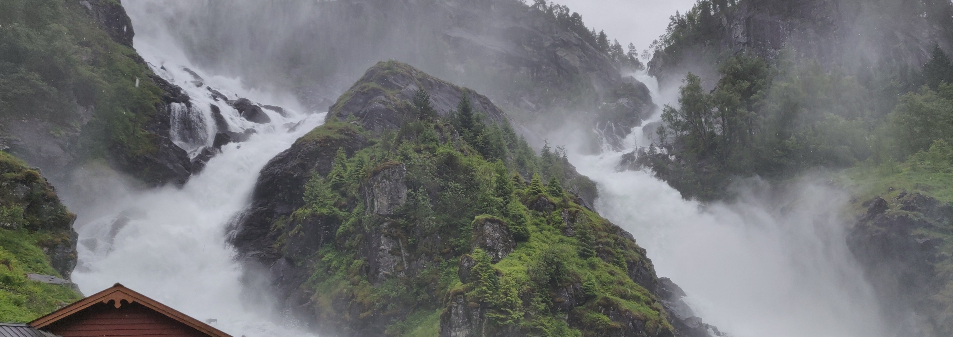 Zelfs met regen en mist blijft Låtefossen een machtig gezicht.
