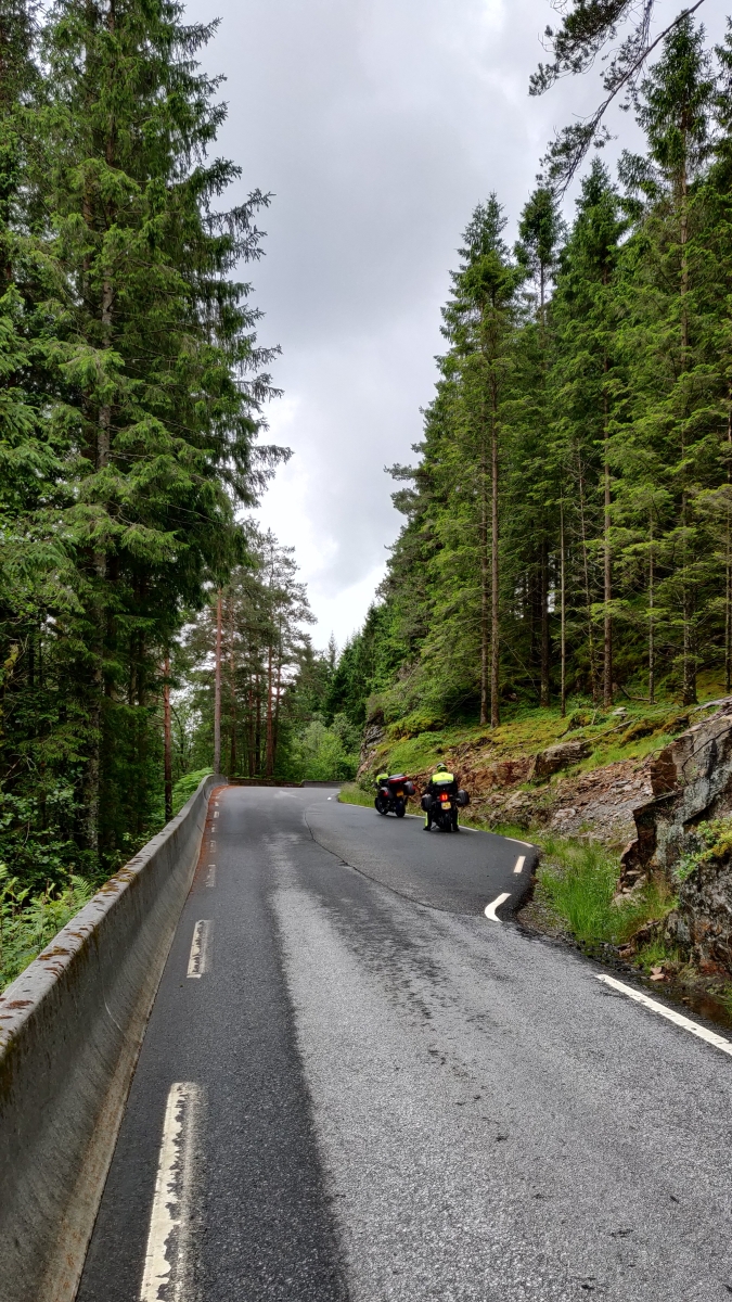 Vandaag start opnieuw met regen, al zijn er gelukkig ook af en toe droge periodes. Met frisse moed pakken we onze motoren in en vertrekken vanaf Botnen Camping richting Brekke, vanwaar we de veerboot nemen naar Lavik. De route die volgt kronkelt prachtig door het Noorse landschap: smalle bergwegen, diepe dalen en de constante aanwezigheid van water en bergen maken elke bocht een klein avontuur.