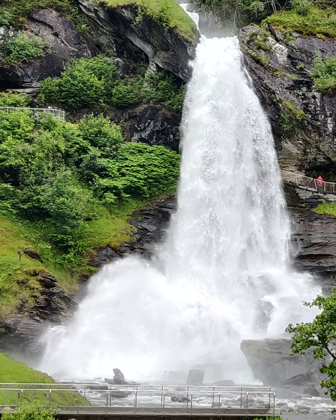 Bij Norheimsund bereiken we de imposante Steinsdalsfossen. Wat deze 50 meter hoge waterval zo bijzonder maakt, is dat je er veilig en volledig droog achterlangs kunt lopen. Via een kort, verhard pad loop je vanaf de parkeerplaats onder de overhangende rots door, met voor je het neerstortende water. Ondanks het regenachtige weer is dit een plek die nooit teleurstelt. Het gesteente, de kracht van het water en het donderende geluid geven een indrukwekkende kijk achter de schermen van de natuur.
