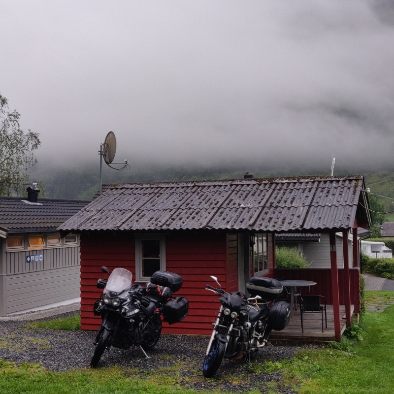 Vandaag hadden we “heel goed weer om motor te rijden” , dat soort typisch Noors understatement waarmee motorrijders toegeven dat nat weer eigenlijk ontzettend leuk kan zijn.Aan het einde van de middag arriveren we bij Botnen Camping, waar we voor een redelijke prijs een hutje weten te huren. Een warme, droge plek na een lange dag rijden voelt als pure luxe. Met zicht op het water en de bergen sluiten we de dag tevreden af.