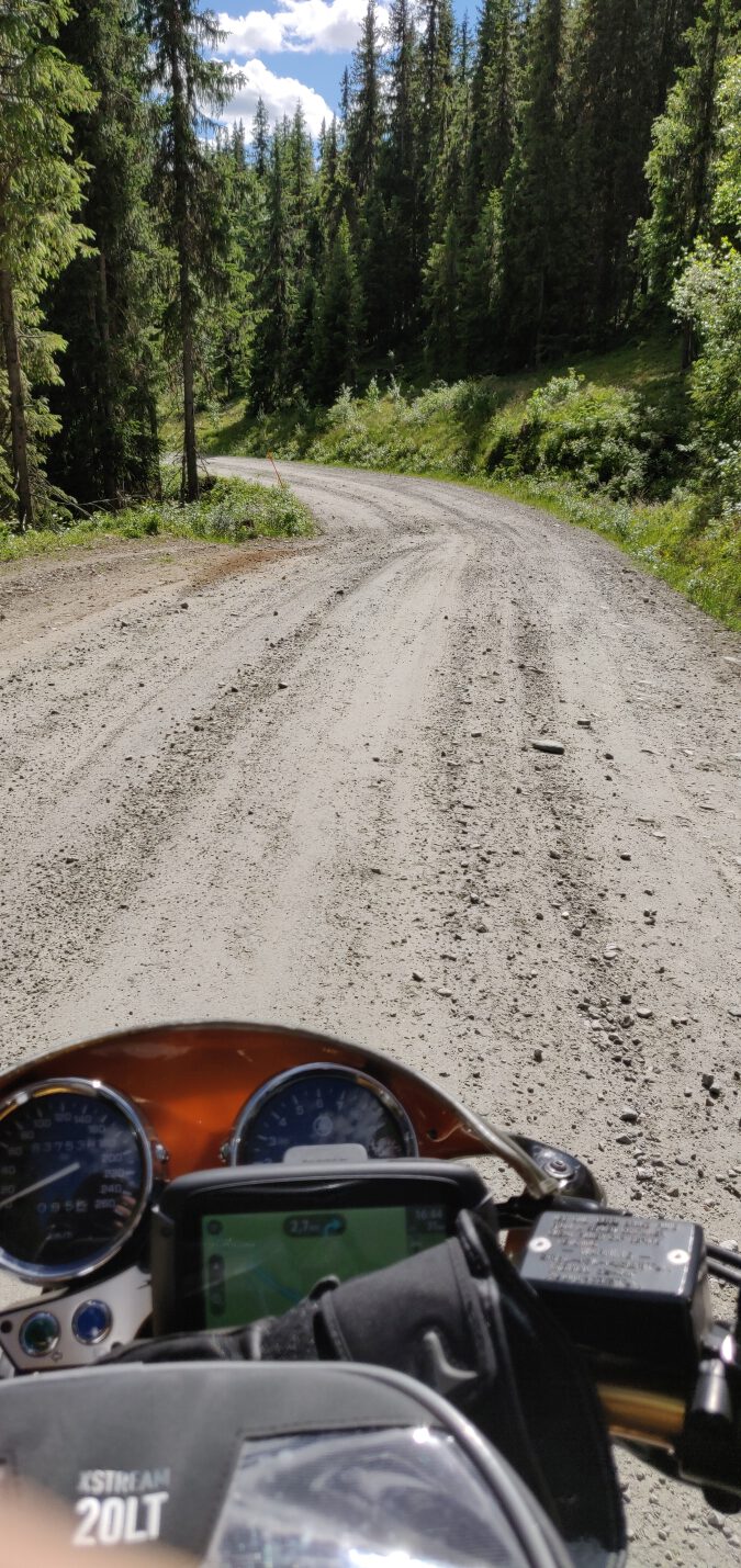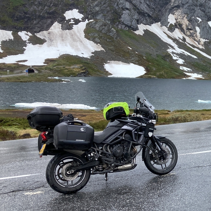 Vandaag begon opnieuw met regen, niet onverwacht in dit deel van Noorwegen, maar ondertussen zijn we eraan gewend. De druppels tikken gestaag op het vizier en zo nu en dan zorgt condens in de helm voor wat kleine ongemakken, maar het hoort bij het avontuur. Bovendien laten we ons humeur er niet door beïnvloeden; met de juiste kleding en instelling blijft rijden in de regen verrassend prettig.