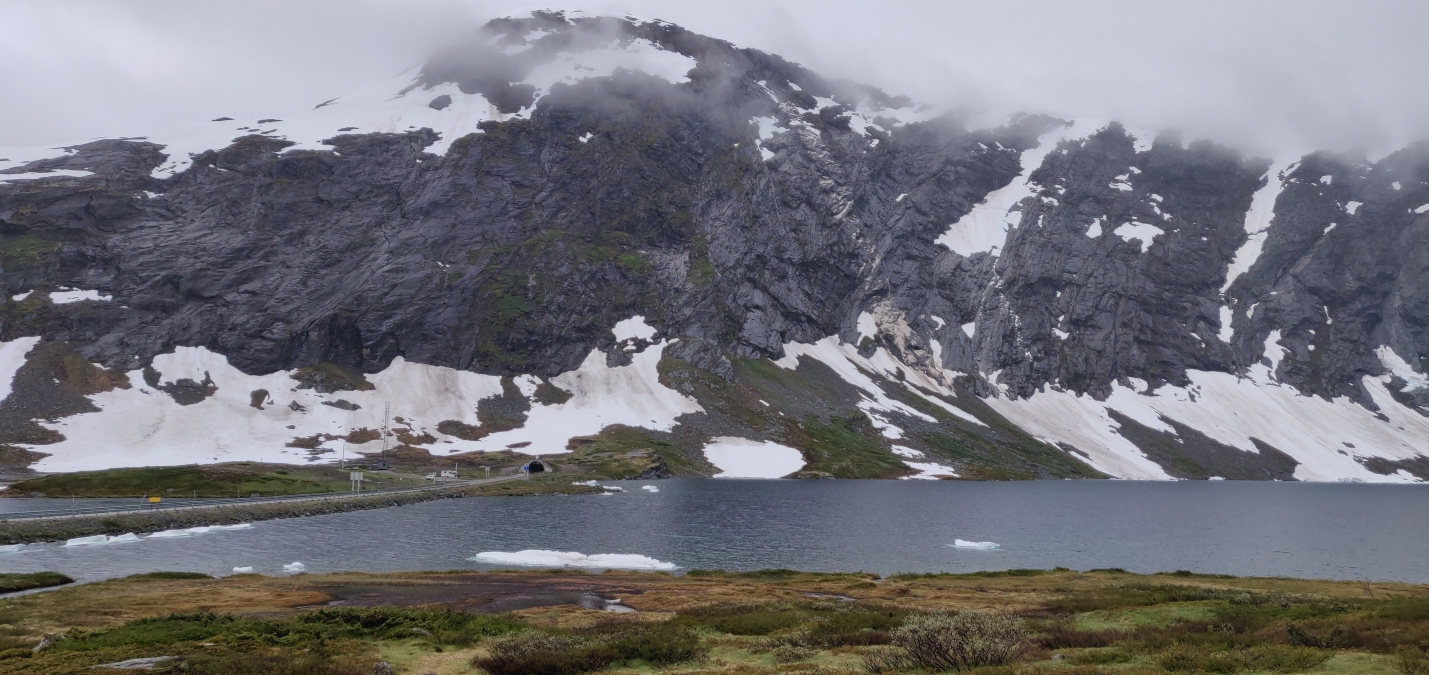 We vervolgden onze weg richting Dalsnibba, de hoogste top die met de auto of motor in Noorwegen bereikbaar is. Voor deze rit wordt tol geheven, ongeveer €15,-. Door de laaghangende wolken konden we echter nauwelijks iets zien. Het was spannend rijden op sommige delen van de weg, waar geen vangrails waren. Ondanks het mistige uitzicht bereikten we het hoogste punt van onze reis.