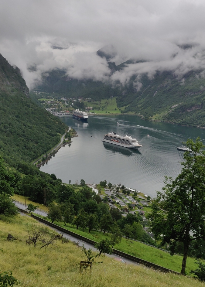 Na het afdalen van Dalsnibba kregen we onder de wolken zicht op het indrukwekkende Geirangerfjord. Lager gelegen uitzichtpunten boden adembenemende panorama’s van de fjord, met bekende watervallen zoals De zeven zusters, Brudesløret en Friaren. Andere indrukwekkende plekken onderweg zijn Storsæterfossen, waar je onderdoor kunt lopen, en Flydalsjuvet, een rotsachtig uitkijkpunt met zicht over de fjord.
