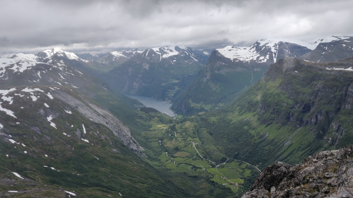 Daarna begonnen we opnieuw aan de klim naar Dalsnibba. Wat gisteren in de mist verborgen bleef, ontvouwde zich nu in volle glorie. Vanaf de top hadden we een perfect zicht op het zo’n 1600 meter lager gelegen Geirangerfjord. De besneeuwde toppen, het diepblauwe water en de indrukwekkende hoogteverschillen maakten dit moment misschien wel het absolute hoogtepunt van de dag.