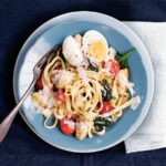 • .Snijd de artisjokbodems in vieren en voeg deze toe. Giet de pasta af en schep het mengsel om. Voeg de spinazie in delen toe en laat deze al omscheppend slinken. Doe de tomaten erbij en worm nog 1 minuut door. Pel de eieren en leg deze gehalveerd over de pasta.