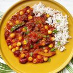 Vegetarische bonenschotel met rijst.